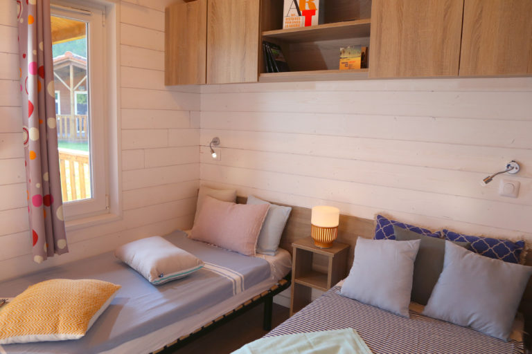 The Chalet Duo has two single beds (which can be moved closer together if necessary) with a desk area and all the necessary storage space as well as a bathroom with shower cubicle, washbasins and toilet.